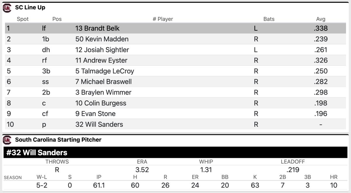 - An RBI-single by Madden makes it 9-2 in favor of South Carolina.