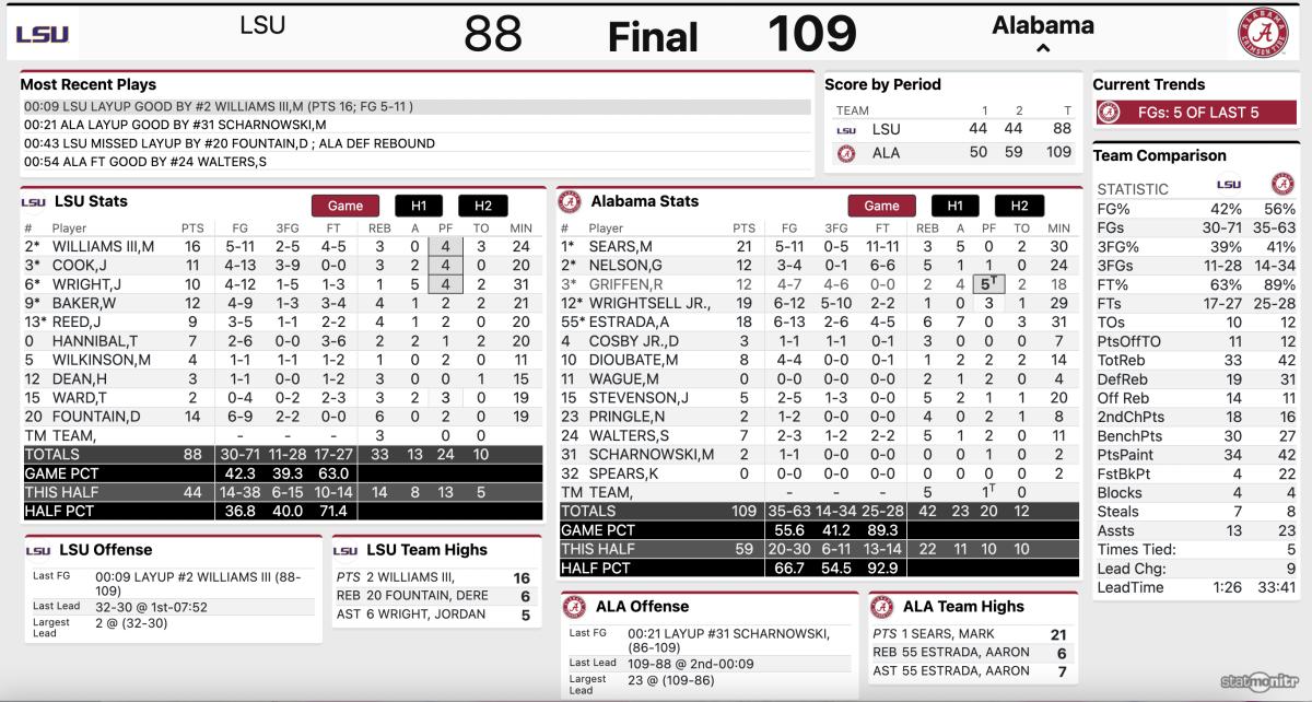 - 7:43- The blowout is underway. Alabama leads LSU 90-69 at the under-8 media timeout, and Sears will be shooting one free throw coming out of the break. Alabama is on pace for its highest scoring output of the season.