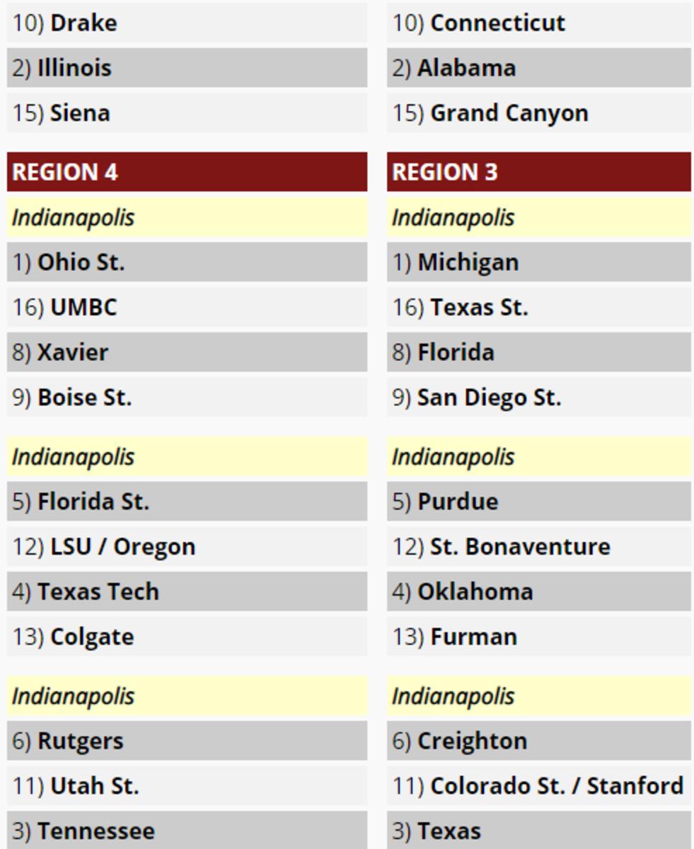 He has Indiana's first-round matchup coming against Colorado, where the winner would take on the winner of Alabama versus UMBC.