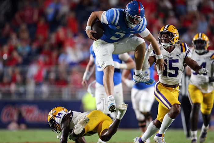 Sep 30, 2023; Oxford, Mississippi, USA; Mississippi Rebels quaterback Jaxson Dart (2) leaps over LSU Tigers defensive back Andre' Sam (14) during the second half at Vaught-Hemingway Stadium. Mandatory Credit: Petre Thomas-USA TODAY Sports