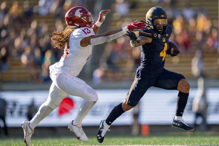 California Golden Bears wide receiver Nikko Remigio (4) runs against Washington State Cougars linebacker Jahad Woods (13) during the third quarter at FTX Field at California Memorial Stadium.
