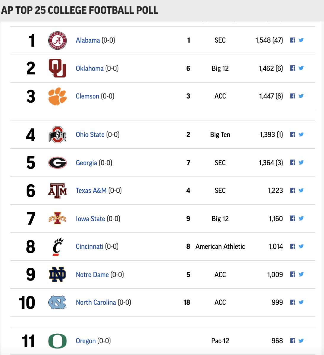 To no one's surprise, the defending national champion Alabama Crimson Tide hold down the No. 1 spot, earning 1,548 points and 47 first-place votes. The Tide were followed by Oklahoma (6 first place votes), Clemson (6), Ohio State (1) and Georgia (3) to round out the top five and were the only programs to receive first-place votes.