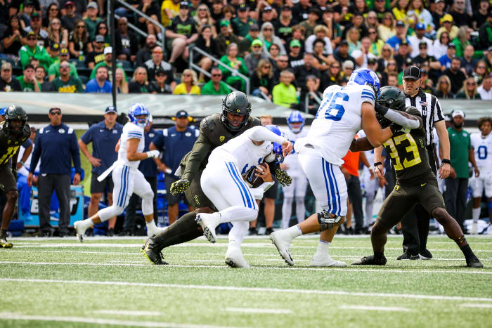 Oregon Ducks outside linebacker DJ Johnson tackles BYU quarterback Jaren Hall in week 3 at Autzen Stadium.