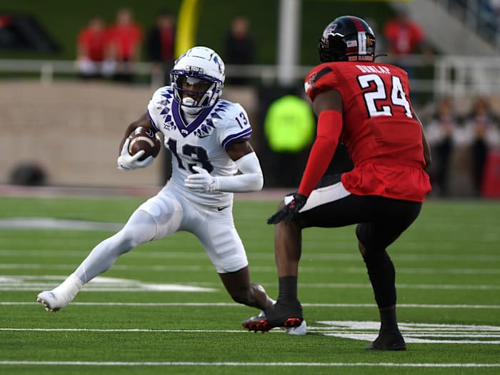 TCU's wide receiver Jaylon Robinson (13) runs with the ball against Texas Tech in a Big 12 football game, Thursday, Nov. 2, 2023, at Jones AT&T Stadium.