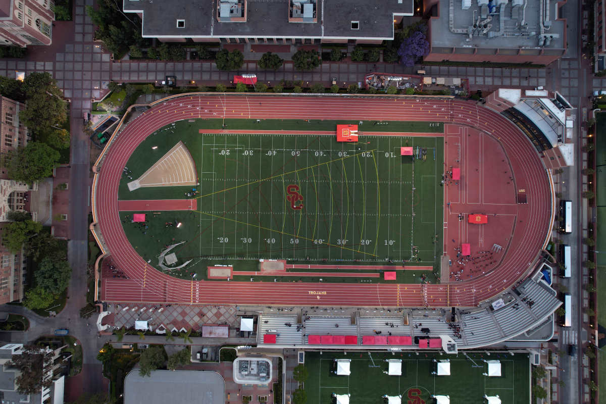 An overhead view of Allyson Felix field at Loker Track Stadium & Colich Center