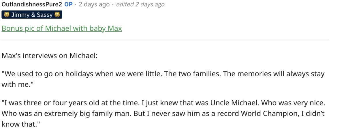 "'I was three or four years old at the time. I just knew that was Uncle Michael. Who was very nice. Who was an extremely big family man. But I never saw him as a record World Champion, I didn’t know that.'"