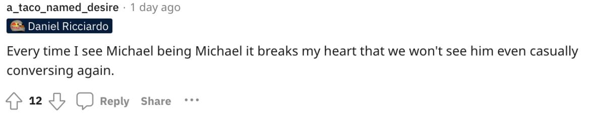 "Every time I see Michael being Michael it breaks my heart that we won't see him even casually conversing again."