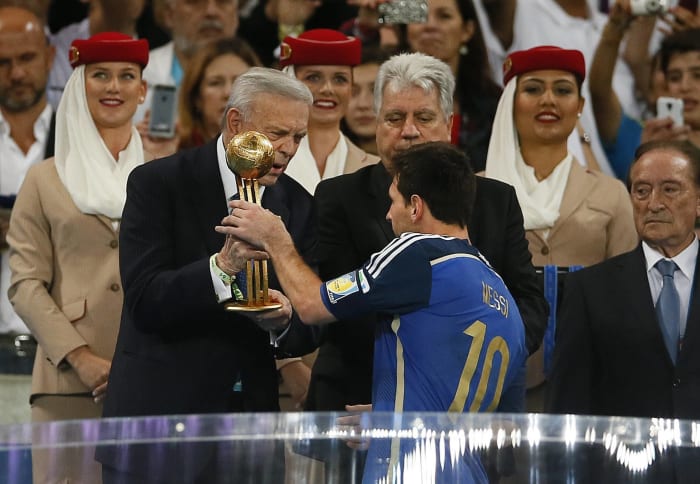 Lionel Messi pictured collecting his first World Cup Golden Ball trophy in 2014