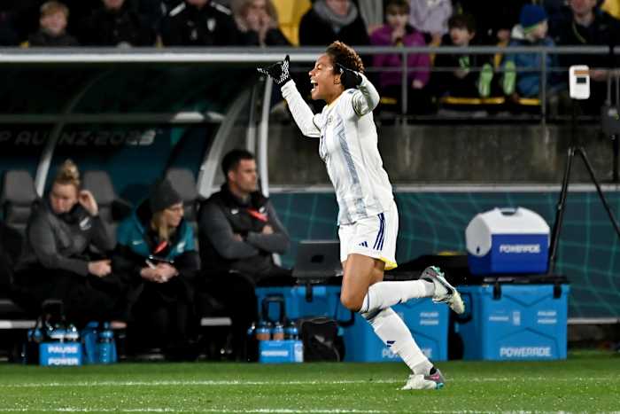 Philippines forward Sarina Bolden pictured celebrating after scoring her nation's first ever FIFA World Cup goal in a 1-0 win over New Zealand