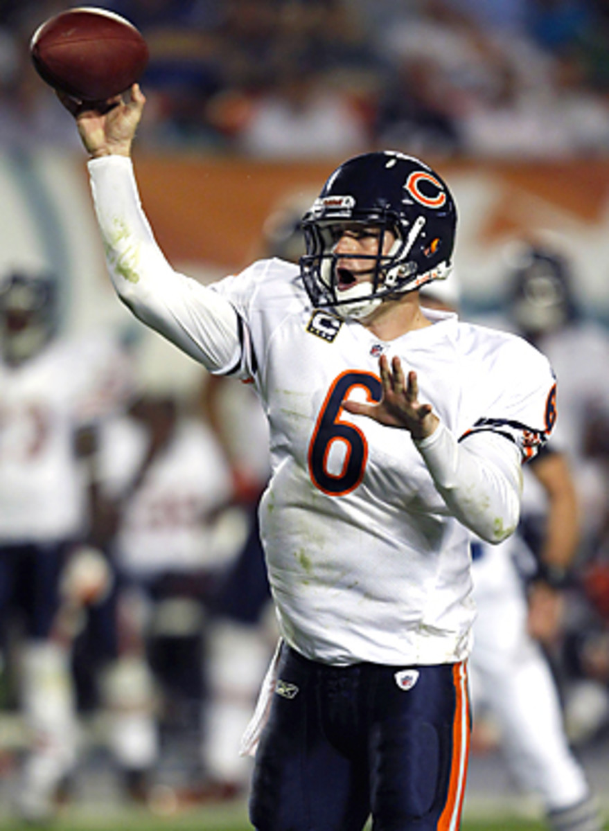 2. Dare we say 'No Name Defense' in Miami ... and talk about the Bears? Chicago's defense has ranked in the top five all year, while consistently getting off the field on third down, forcing turnovers, picking off the ball, stuffing the run and pressuring the quarterback. And yet, outside of Julius Peppers and Brian Urlacher, how many Bears defenders can most casual fans name? Lance Briggs? OK. Other than that, this has been the epitome of team defense and brilliant scheme. Defensive coordinator Rod Marinelli has put together a no-name squad that has bought into the program. Considering Cutler and the running game we saw Thursday, this Bears defense could lead Chicago to something special this year. For the night, Chicago sacked Miami QB Tyler Thigpen six times and limited the Dolphins to just seven first downs and 39 yards rushing.