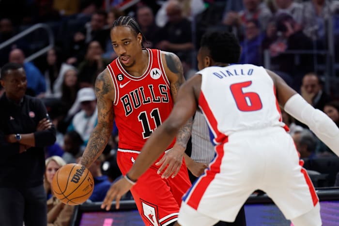 Chicago Bulls guard DeMar DeRozan playing against the Detroit Pistons.