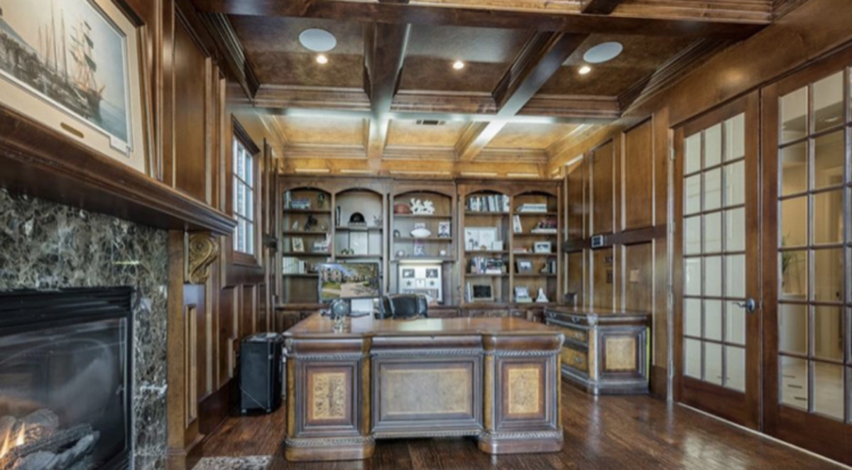 The “European-inspired manor” features 5,3000 square feet, with five bedrooms and seven bathrooms, all starting with a front door area with fluted stone columns and two more Corinthian columns in the foyer and the formal dining room. There’s a gorgeous library/office, a contemporary fireplace and bright walls of windows that overlook the luxury backyard, which is highlighted by a lagoon-style swimming pool.
