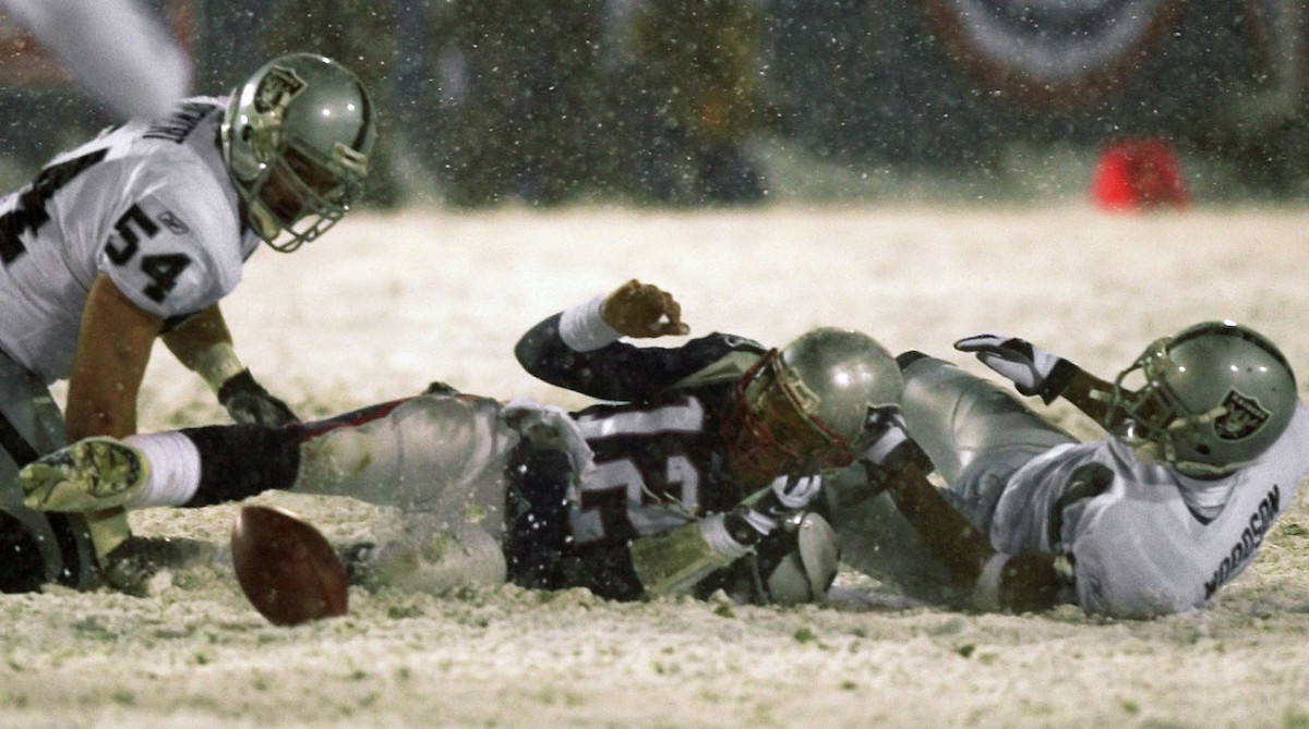 Jan. 19, 2002:Raiders vs. Patriots in an AFC divisional showdown. Brady’s first playoff game. A home field white with snow. Down 13–10 with 1:50 left on clock and the Patriots at the Raiders’ 42-yard line, Brady steps back to pass, pump-fakes, and then tucks the ball instead. Concurrently, Raiders cornerback Charles Woodson blitzed and knocked the ball out to be recovered by linebacker Greg Biekert. Season over for New England.