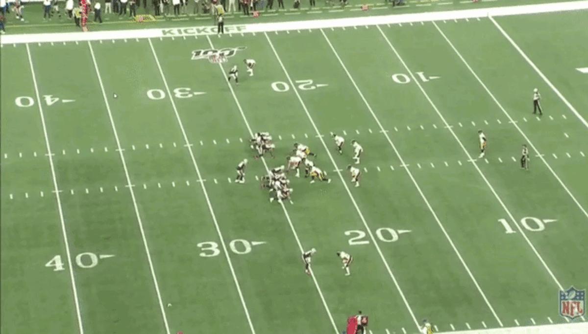 The Patriots can’t block the kick, but they handle the coverage well and get a great return. The far Patriot on the field also drops off the line of scrimmage, waits for the punt to happen, and falls back into coverage to handle the first Steelers’ blocker to get downfield.