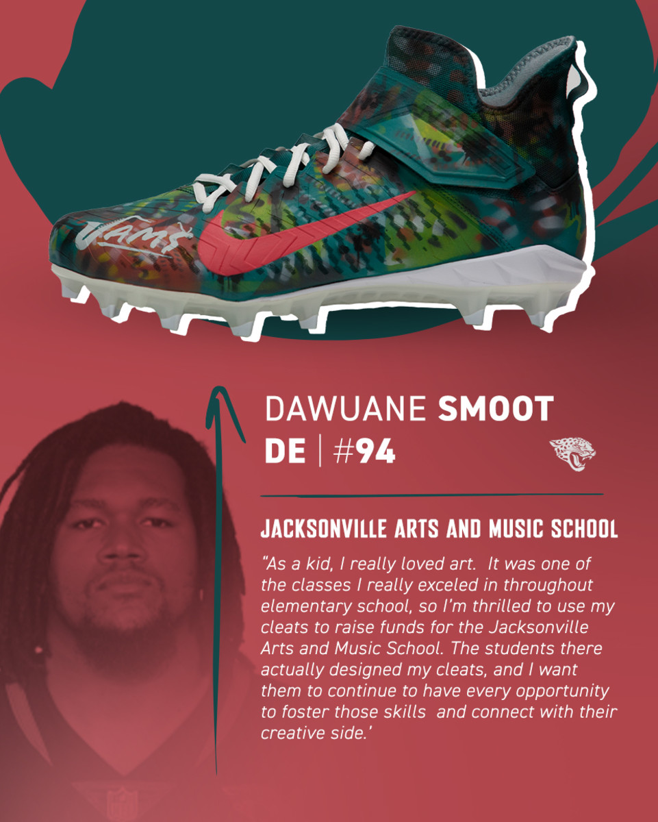 On Sunday, Smoot will wear custom cleats—for the NFL’s annual “My Cause, My Cleats” game—designed by attendees of the Jacksonville Arts and Music School (JAMS).