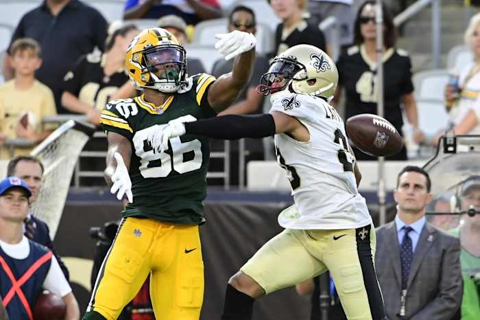 New Orleans Saints cornerback Marshon Lattimore (23) breaks up a pass intended for Packers receiver Malik Taylor (86). Mandatory Credit: Tommy Gilligan-USA TODAY