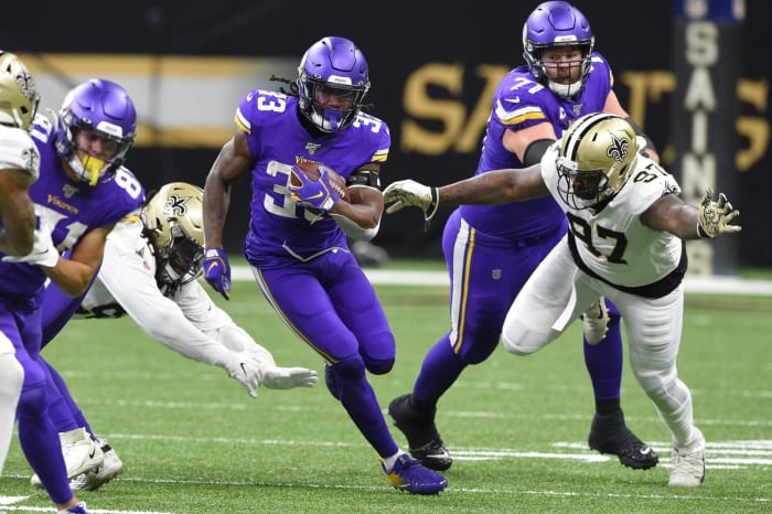 Jan 5, 2020; Minnesota Vikings running back Dalvin Cook (33) runs the ball against the New Orleans Saints during a NFC Wild Card playoff game. Mandatory Credit: John David Mercer-USA TODAY Sports