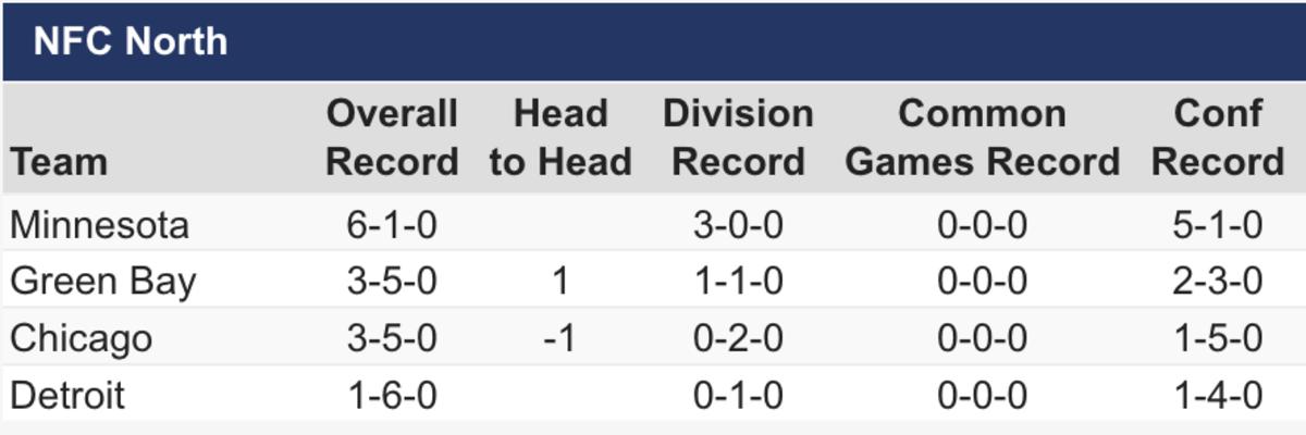What that means is it would take a major Vikings collapse for them not to win the NFC North this season. If Minnesota simply goes 5-5 in its final ten games, the Packers or Bears would have to go at least 8-1 in their final nine games to have a chance at a tiebreaker.