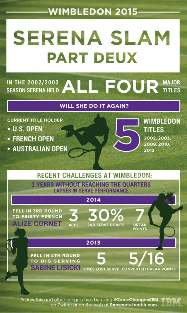 Check SI.com's Wimbledon 2015 data hub page throughout the whole tournament for the latest data-driven infographics and charts from IBM, the official technology partner for Wimbledon. IBM captures and analyzes the data that powers all of the Grand Slams, as well as the digital platforms that extend the experience to fans around the world.